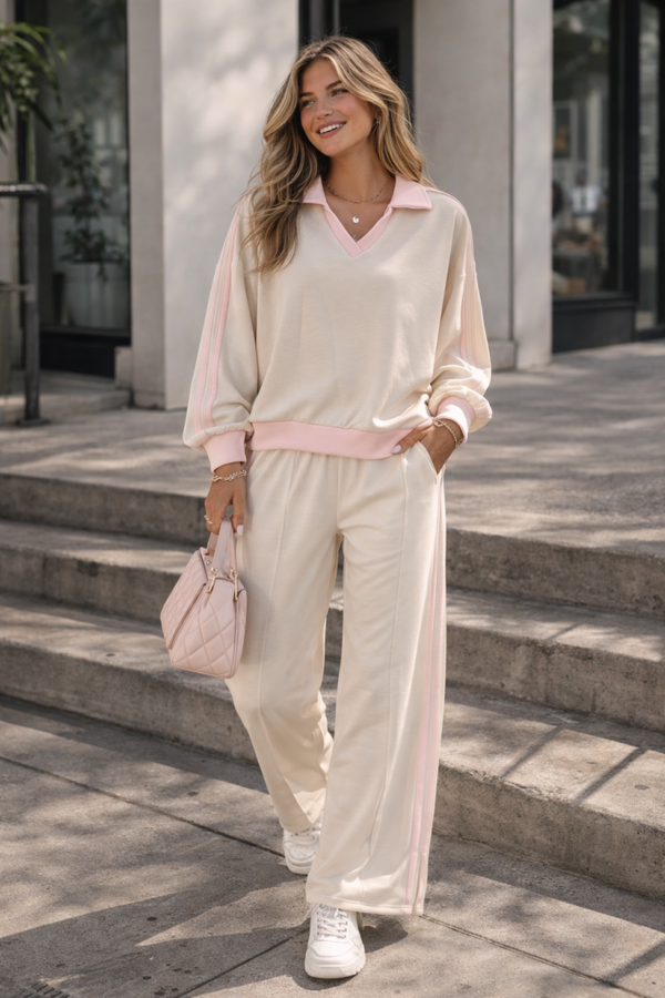Onze Lounge Chic Set is de perfecte combinatie van sportief en vrouwelijk. Een heerlijk zachte two-piece met een relaxte fit, subtiele streepdetails en een elegante V-hals met kraag.